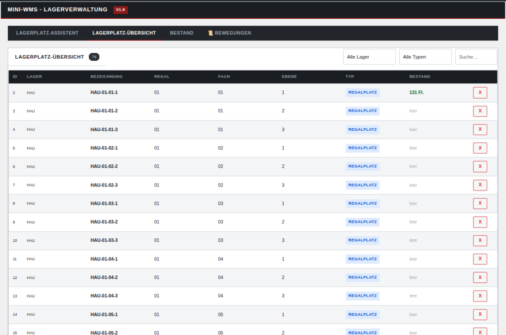 - Transparente Verwaltung: Eine tabellarische Übersicht liefert Echtzeit-Daten über vorhandene Kapazitäten und Kürzel der Lagerorte.