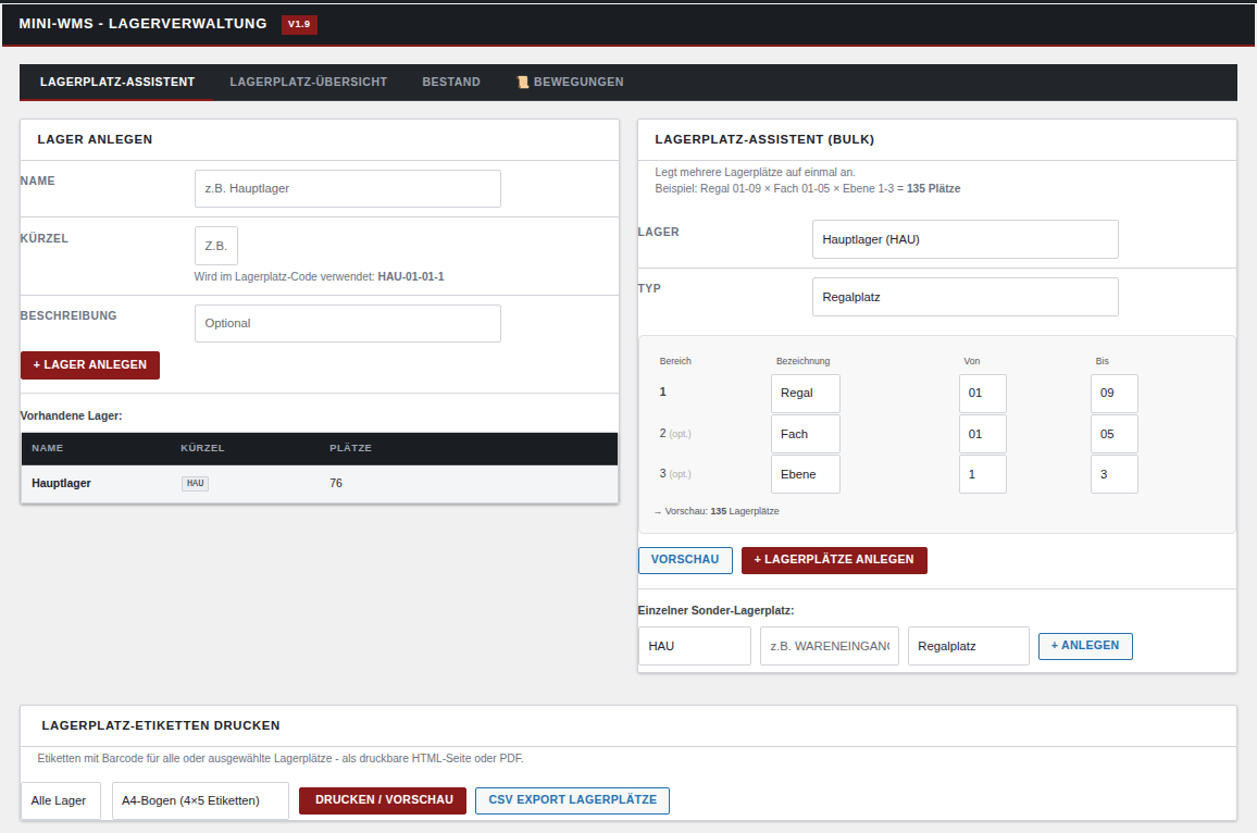 - Effiziente Anlage: Über den Assistenten können einzelne Lagerplätze oder ganze Regalsysteme (Bulk-Funktion) mit wenigen Klicks generiert werden.